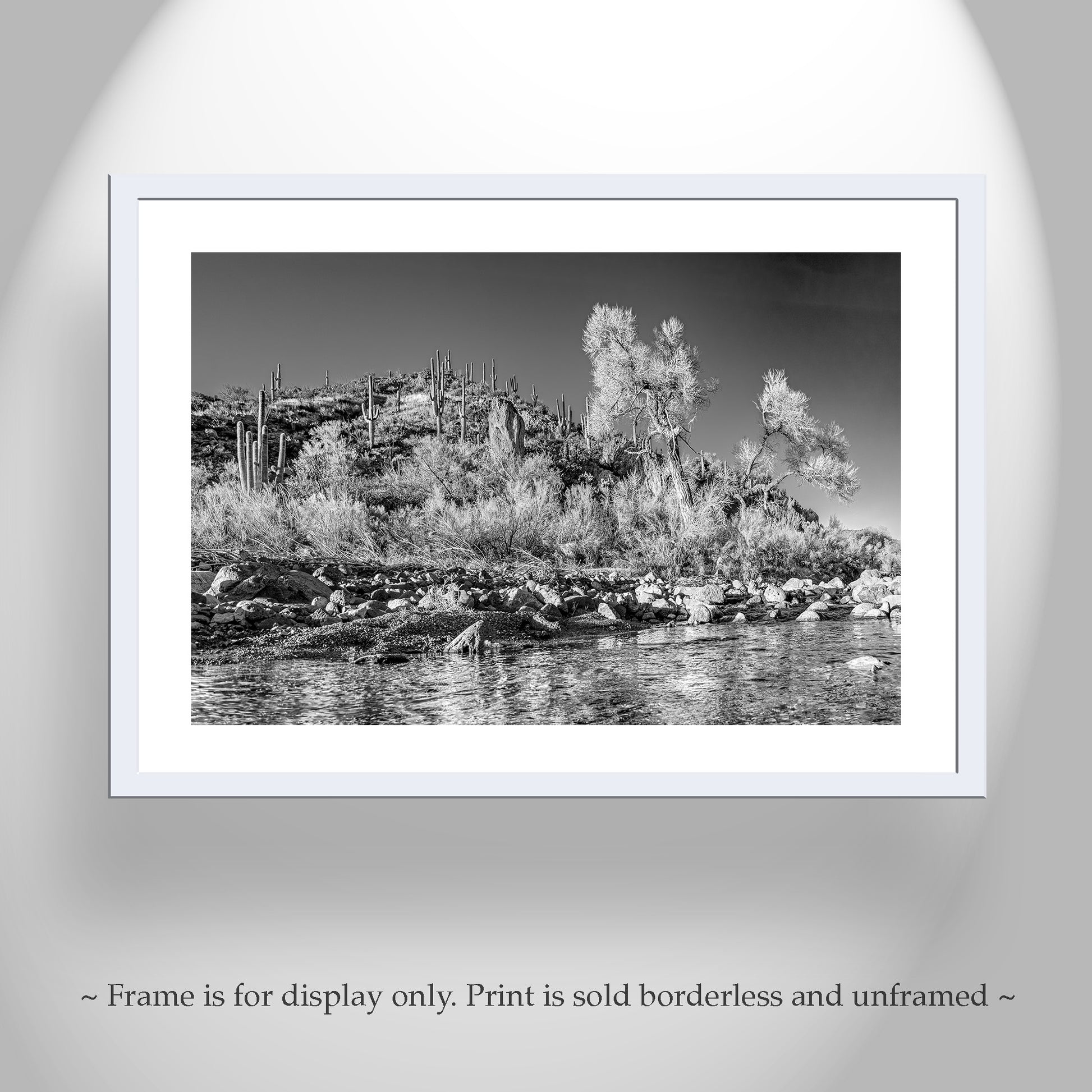 My terrific B&W desert cactus landscape photo with canyon stream! This is a precious, secret canyon in southern Arizona which feeds the endangered San Pedro River. The stream is a spring-fed wonder! The tree in this picture is a cottonwood. Original, unique signed art by Murray Bolesta!
