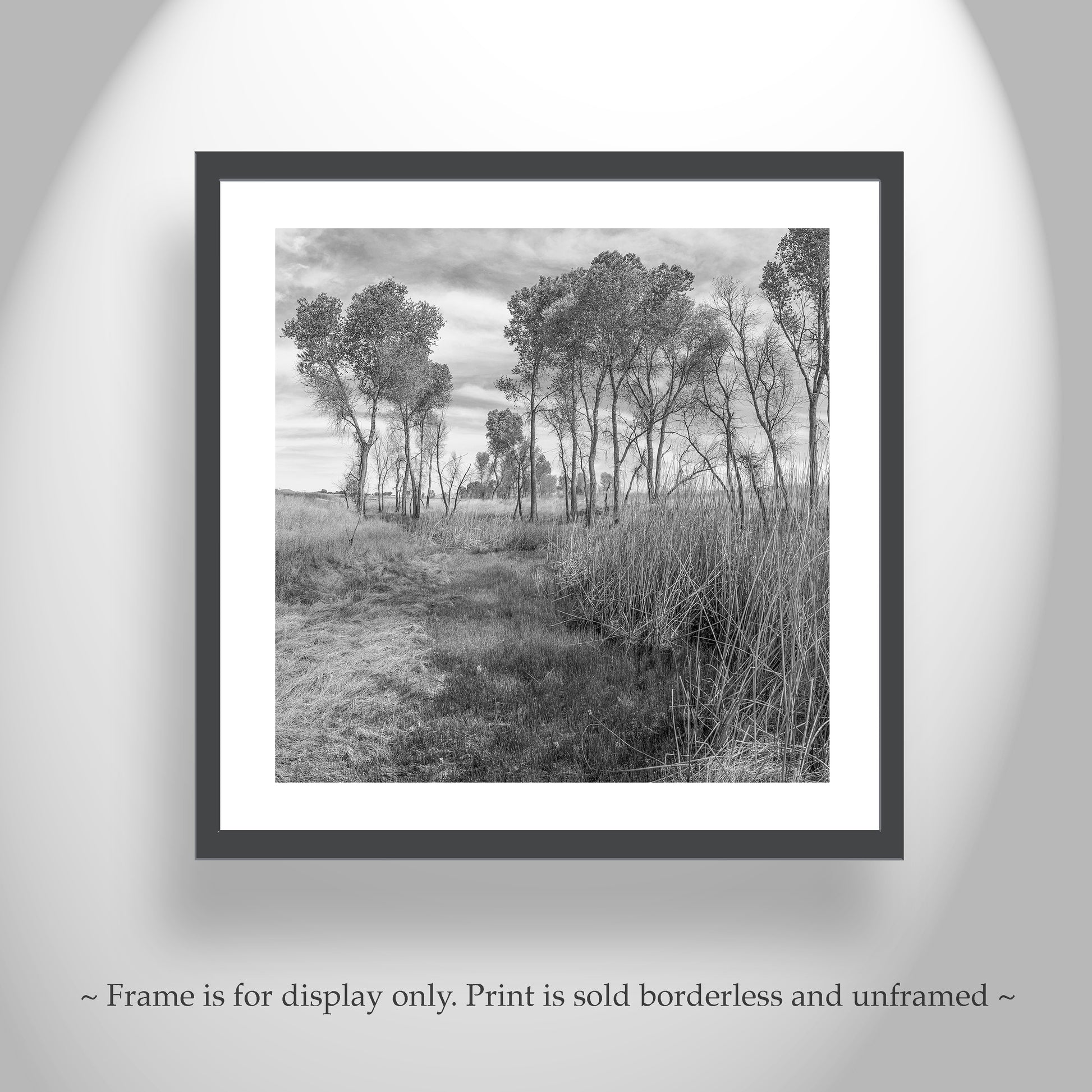 My elegant grasslands landscape photograph from borderlands Arizona USA! Yes, there are prairie landscapes in Arizona, especially in southern Arizona near the Mexico border running north-south. This is Bog Hole Wildlife Area, administered by Arizona Fish & Game, in the incomparable San Rafael Valley of the borderlands! Young cottonwood trees fill the background, with wild grass intervening. Original, unique signed art by Murray Bolesta!