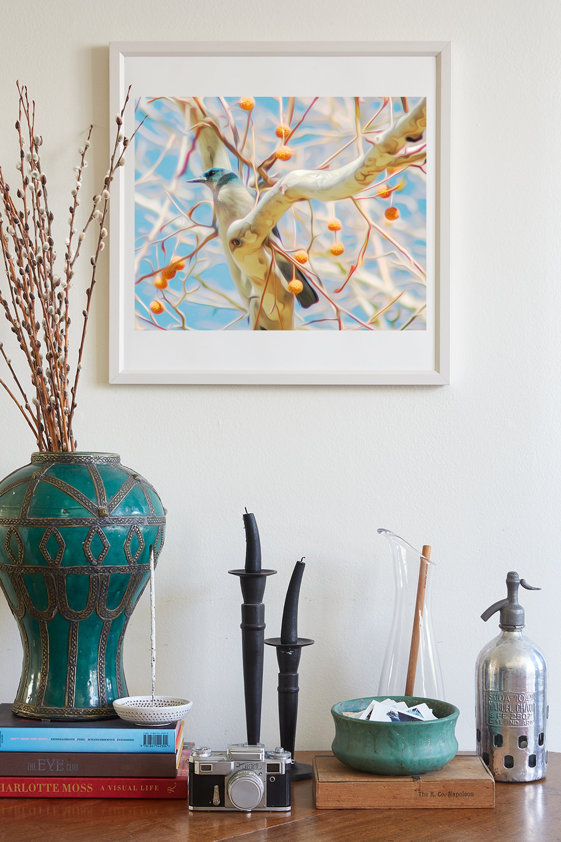 My beautiful blue bird photograph for your walls! The Mexican Jay is a large, raucous bird unafraid of getting close to humans. Its hue is striking. This specimen, surrounded by Sycamore seed pods, was captured on camera by me in the famous Madera Canyon of the Santa Rita Mountains of borderlands Arizona, planet Earth! Original, unique signed art by Murray Bolesta.
