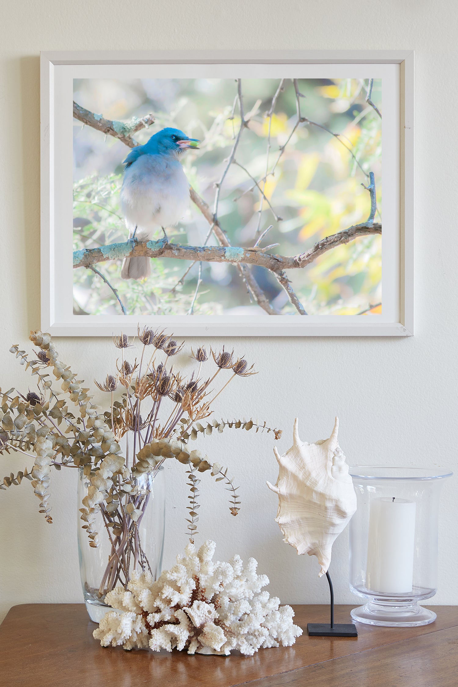 Beautiful bird art! My pretty pastel blue bird photograph for your walls. The Mexican Jay is a large, raucous bird unafraid of getting close to humans. Its hue is striking. This specimen, with an acorn in her beak, was captured on camera by me in the famous Madera Canyon of the Santa Rita Mountains of borderlands Arizona, planet Earth! Original, unique signed art photograph by Murray Bolesta.