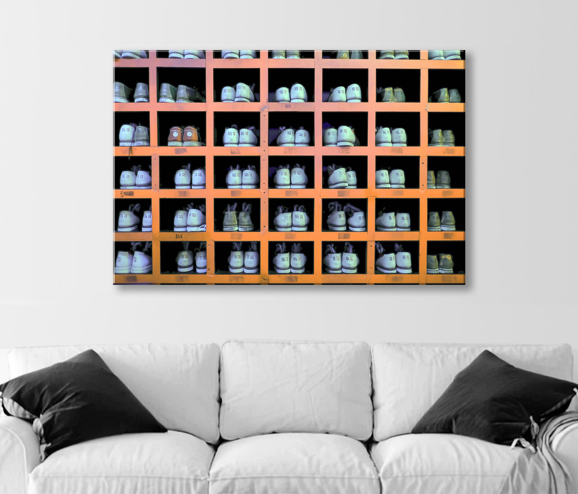 Ten-pin alley: Beautiful bowling art just for you! An old-fashioned wooden rack of bowling shoes of all sizes awaits the eager bowler.
