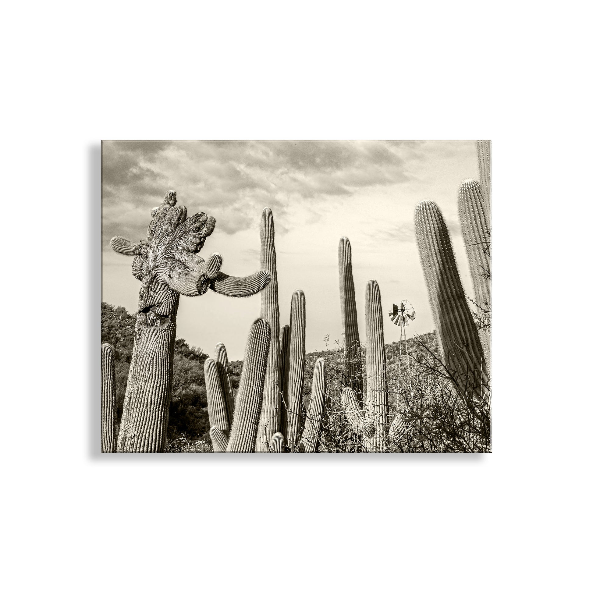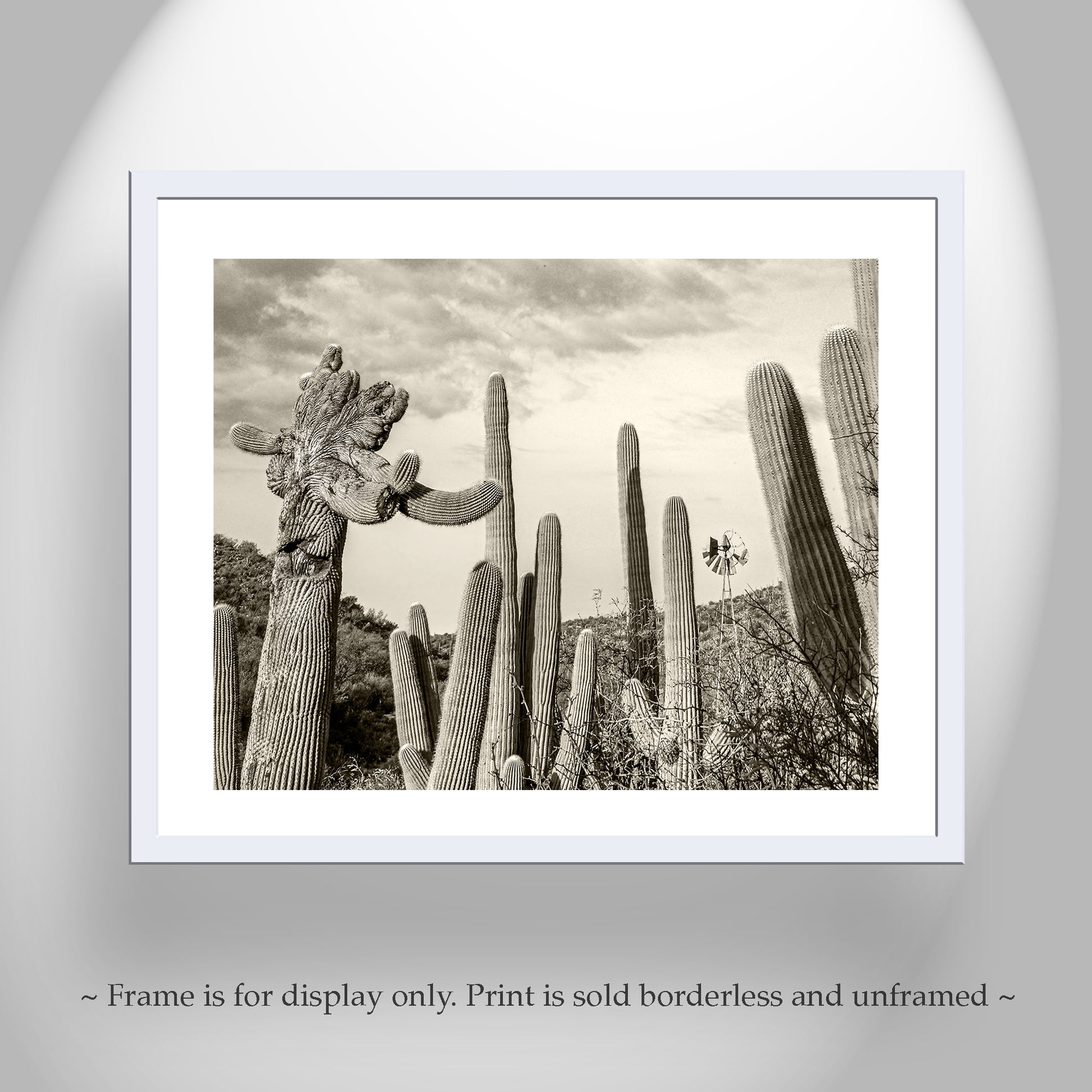 My unique Saguaro cactus wall decor from the Sonoran desert: an old ranch in Saguaro National Park, Tucson Arizona! The crested cactus is nearly as decrepit as the old windmill. Original, unique signed art by Murray Bolesta!