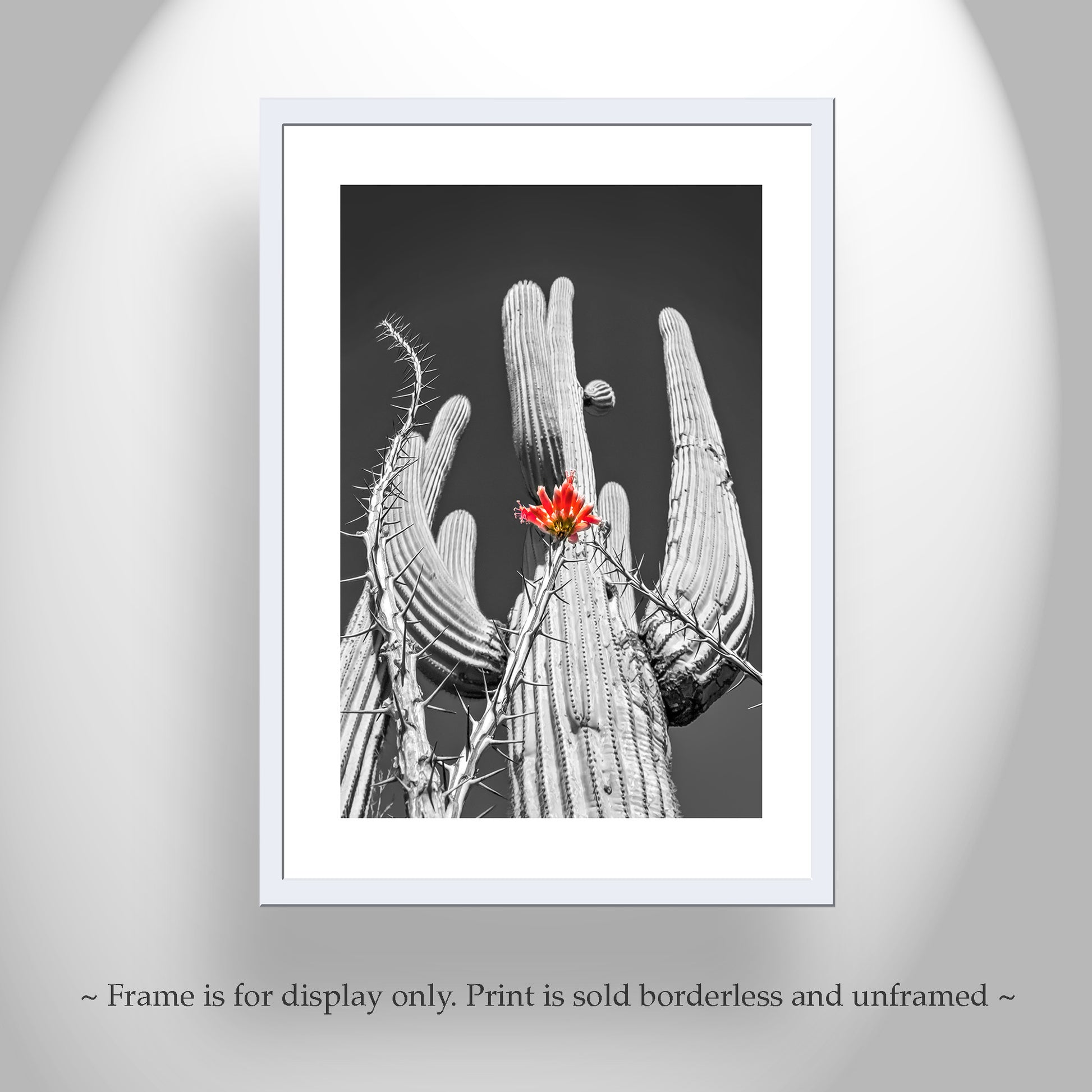 My superb saguaro cactus art for your walls! In this image an ocotillo succulent and its orange-red blossom intervene. I captured this unique scene on a warm spring afternoon in the magnificent Ironwood Forest of southern Arizona, planet Earth! Original, unique signed art by Murray Bolesta.