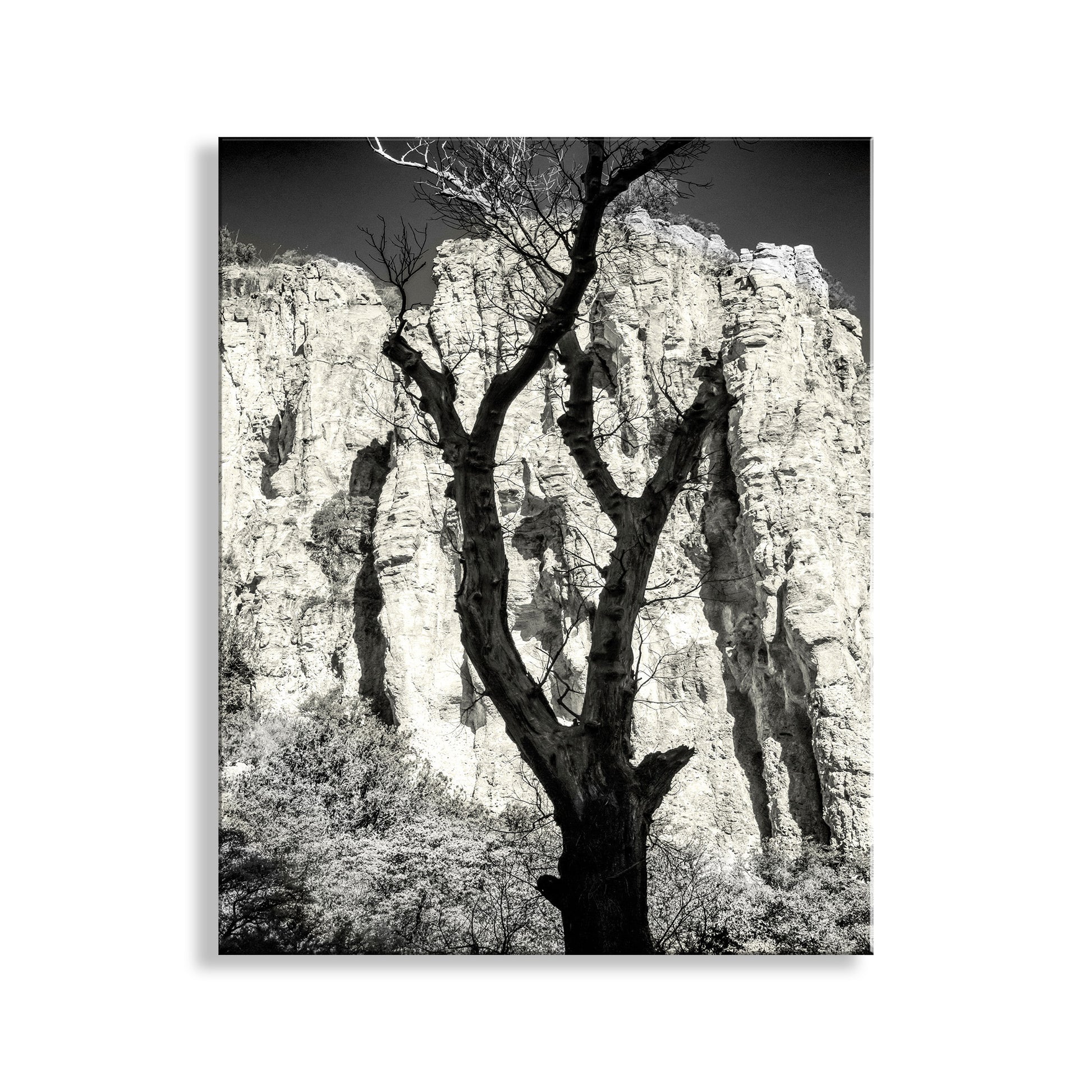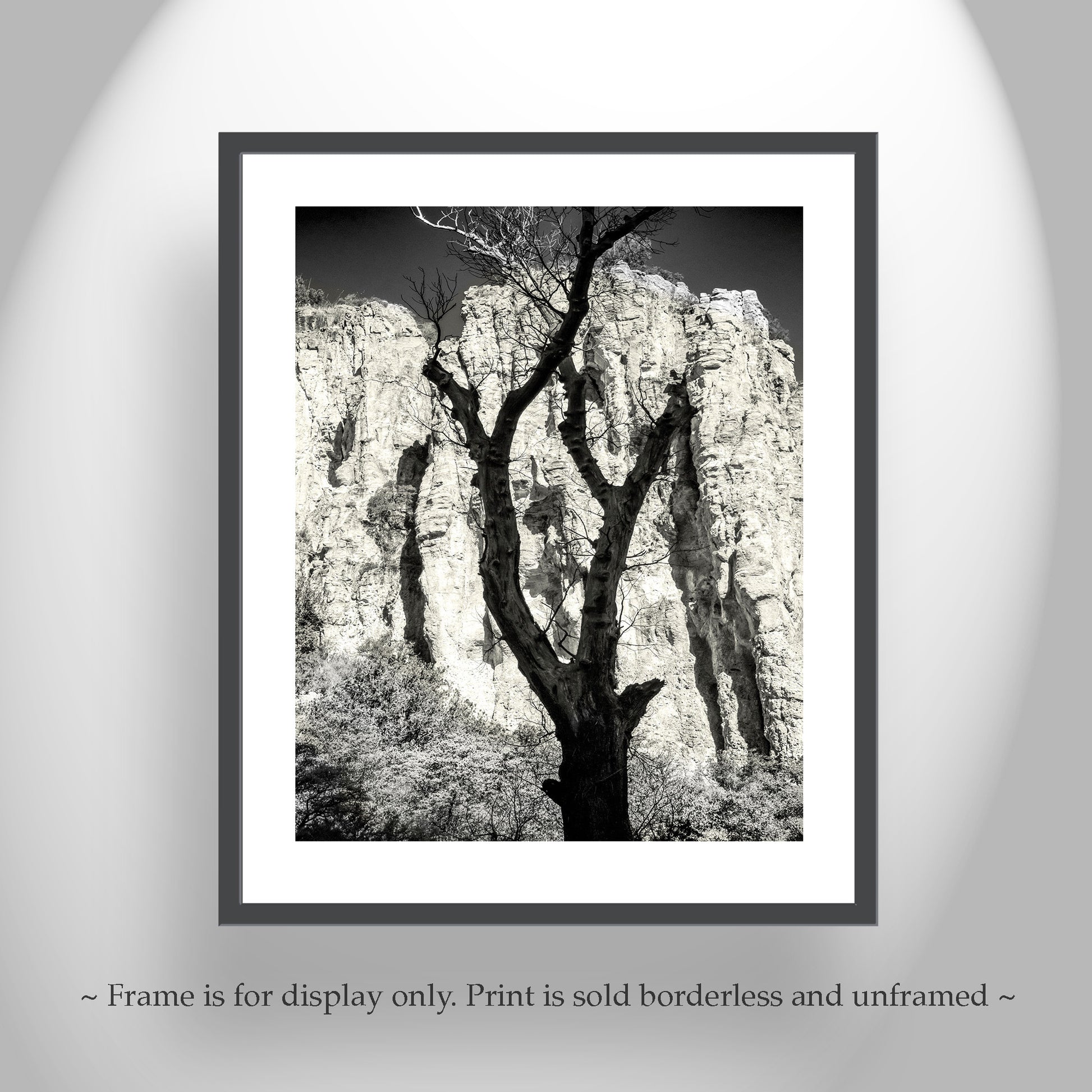 Cool canyon art from southern Arizona USA! One of my fave styles with the silhouette of a spent sycamore tree against the brilliant cliffs of a Pajarita Wilderness canyon on the Mexico border. Original, unique signed art by Murray Bolesta!