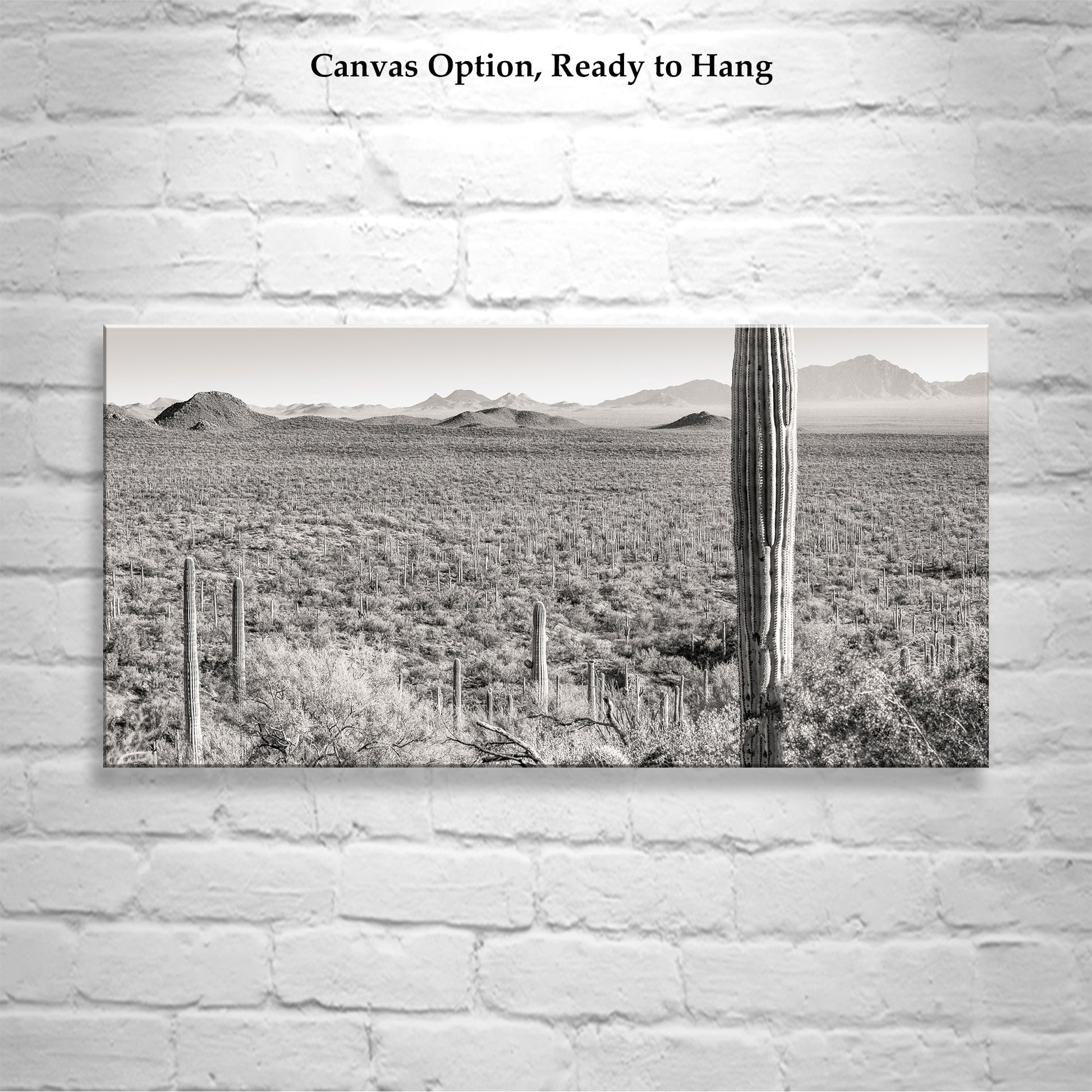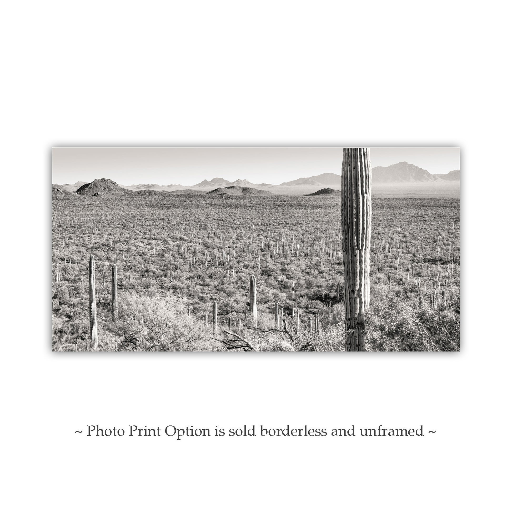 My amazing sepia-toned Arizona desert landscape art print for your walls! This is southern Arizona near Tucson, a vast land called Ironwood Forest National Monument. We're looking through saguaro cacti, south towards Mexico! Original, unique signed art by Murray Bolesta.