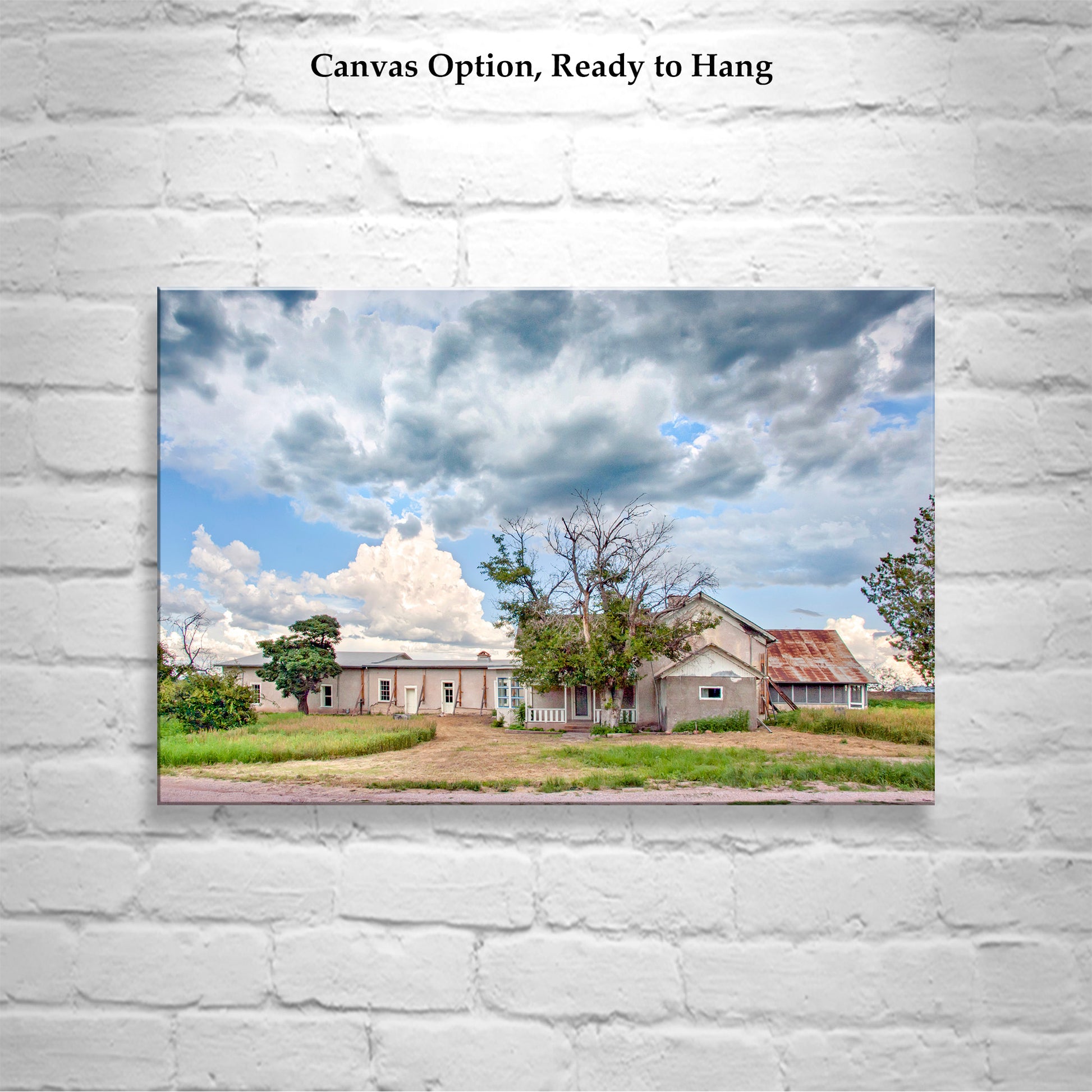Original, unique, signed art by Murray Bolesta! Here's my unique ranch house art print with a genuine adobe barn! (There aren't many of them left.) I captured this intriguing image of historic Empire Ranch House and grounds in a distant decade, before restoration work had begun. This is Sonoita Arizona USA during Arizona monsoon season!