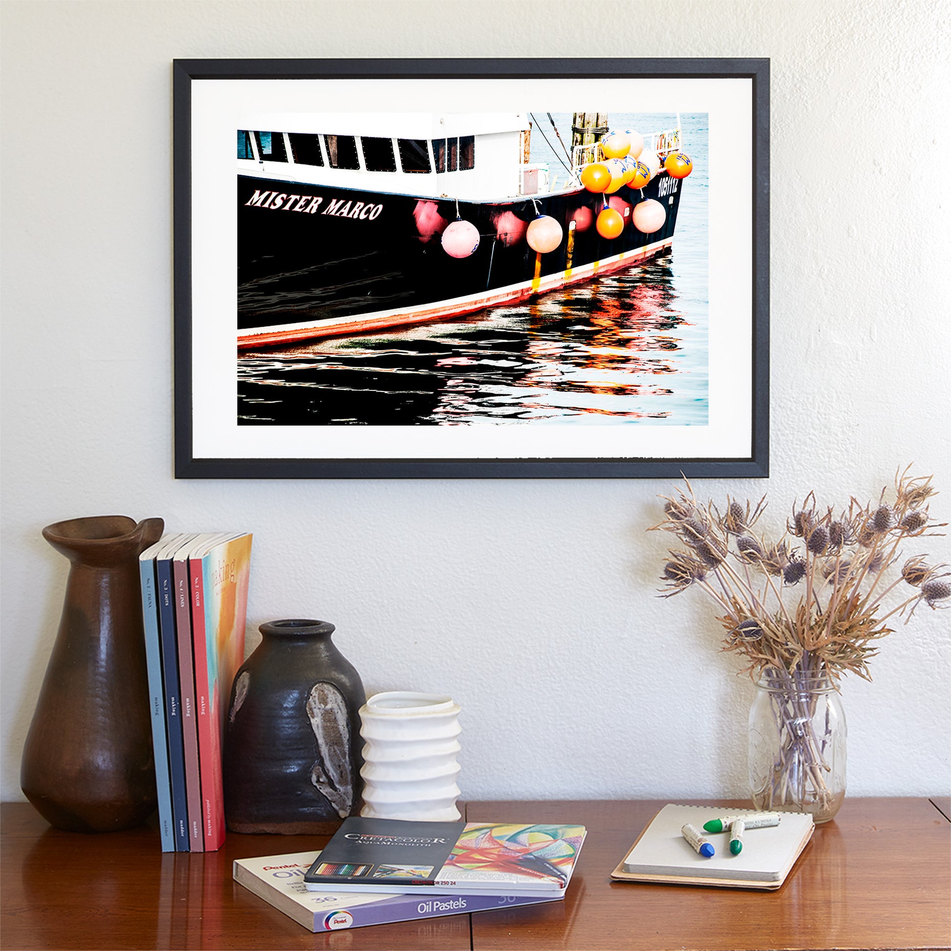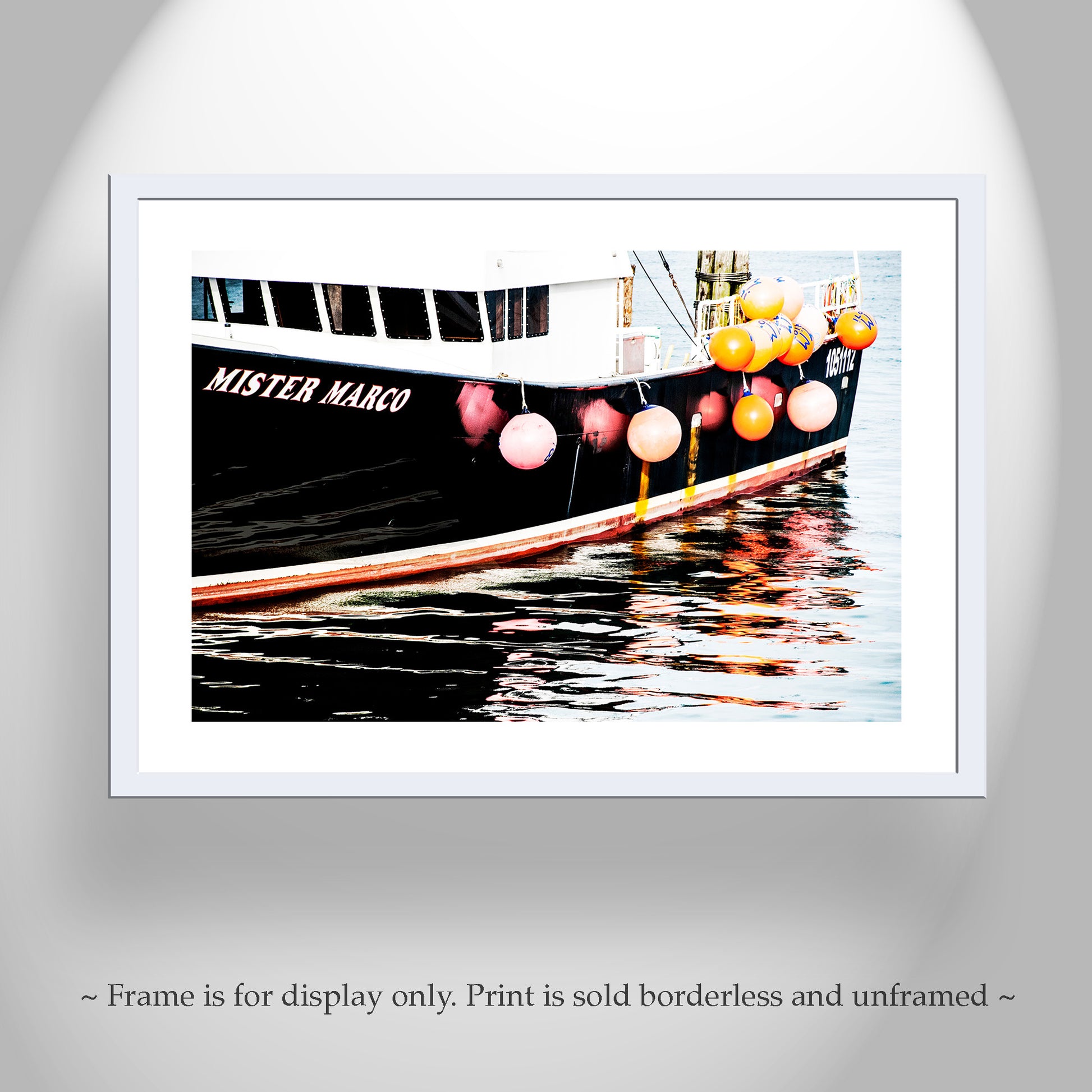 Fishing Boat Art Print with Colorful Fenders as Rhode Island Nautical Wall Decor