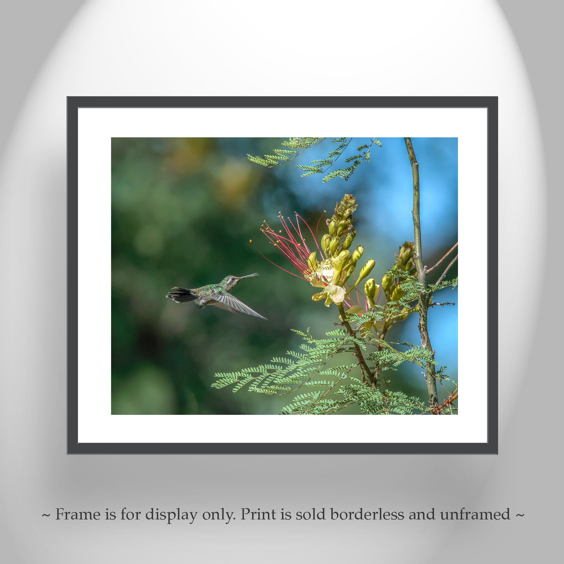 Beautiful bird art! My heavenly hummingbird artworks with a Mexican Bird of Paradise flower, the target of this hovering hummer! I captured this charming scene at Patagonia-Sonoita Creek Preserve, Arizona, planet Earth. This is a triptych, a set of 3 prints sold together. I offer the set at a generous discount to the individual price! Original, unique signed art by Murray Bolesta.
