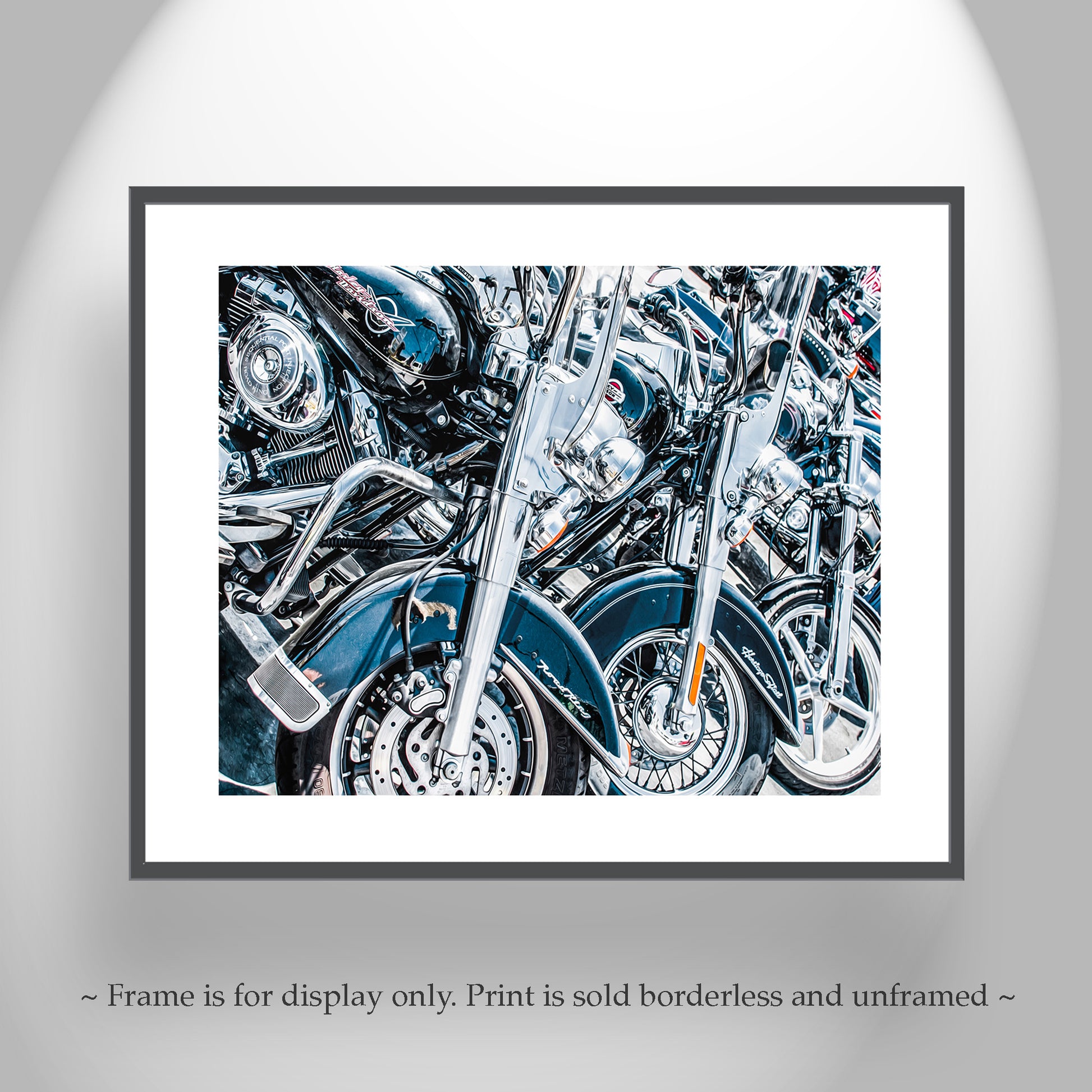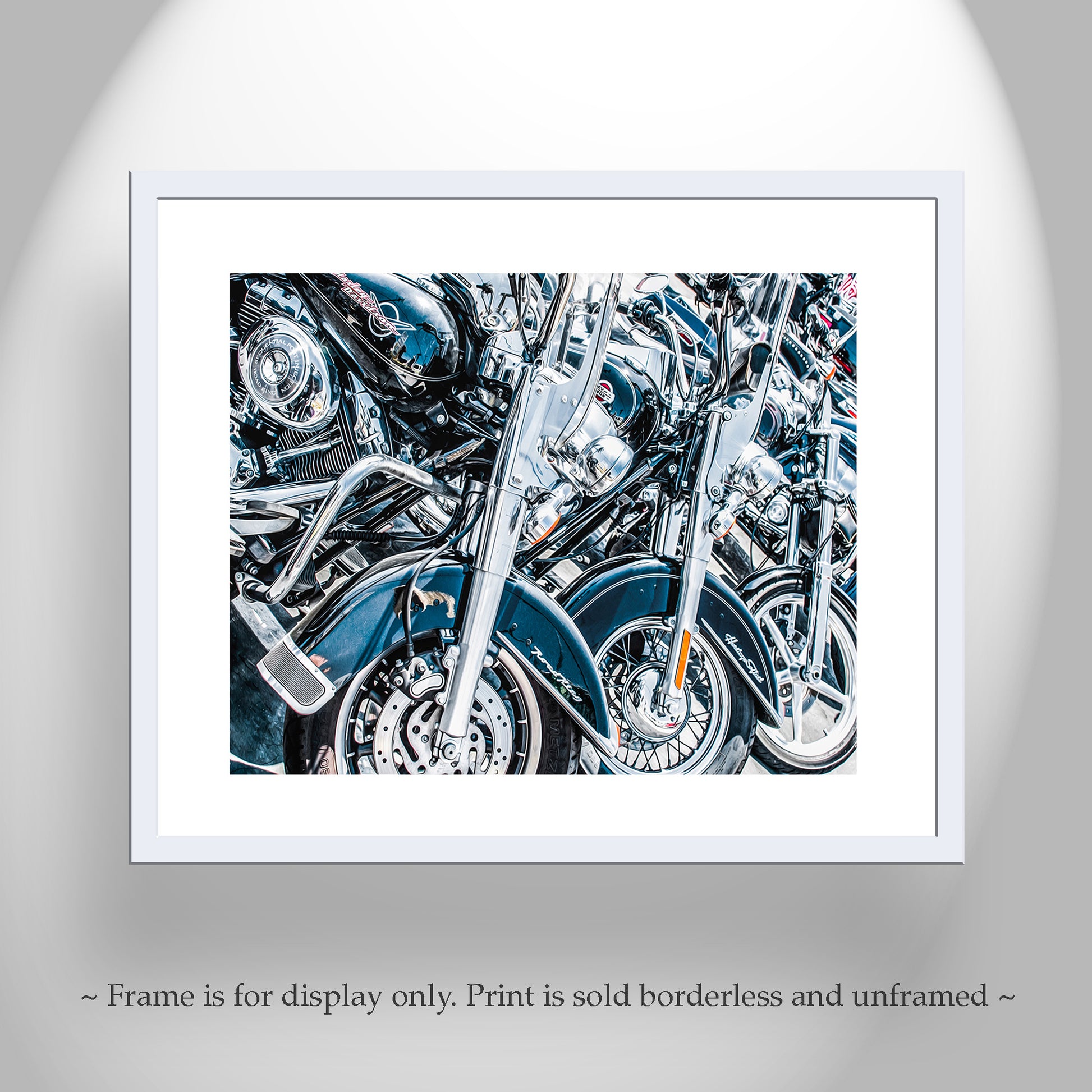 My cool wall art for the biker: a lineup of chrome with Harley Davidson motorcycles attached! I captured this image in San Diego, California. Original, unique signed art by Murray Bolesta!