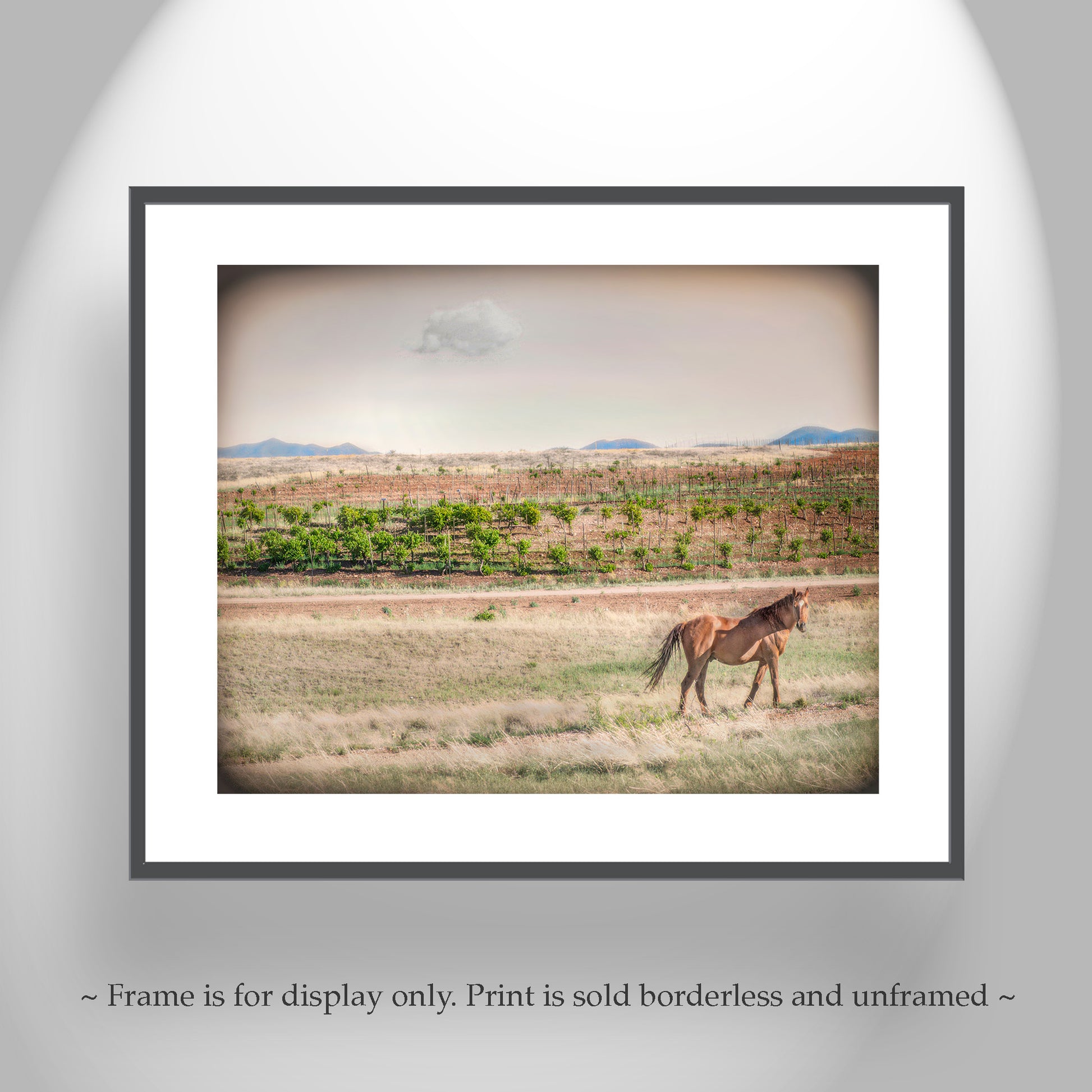 My lovely horse landscape art print with a southern Arizona vineyard! This is horse & wine country at Sonoita-Elgin near the Mexico border with a fledgling vineyard in the hills. Original, unique signed art by Murray Bolesta.