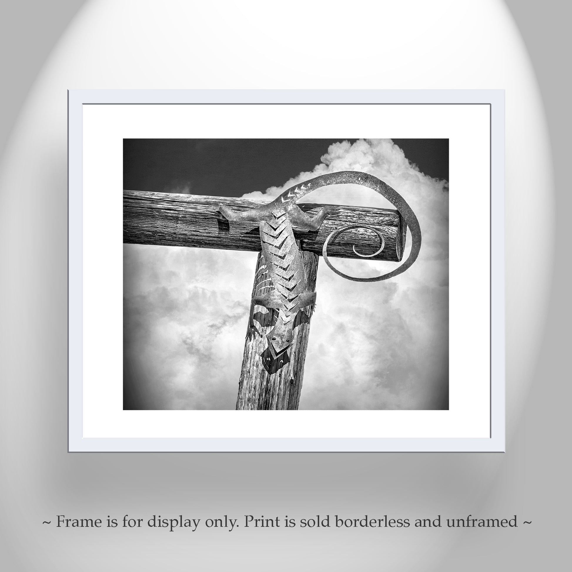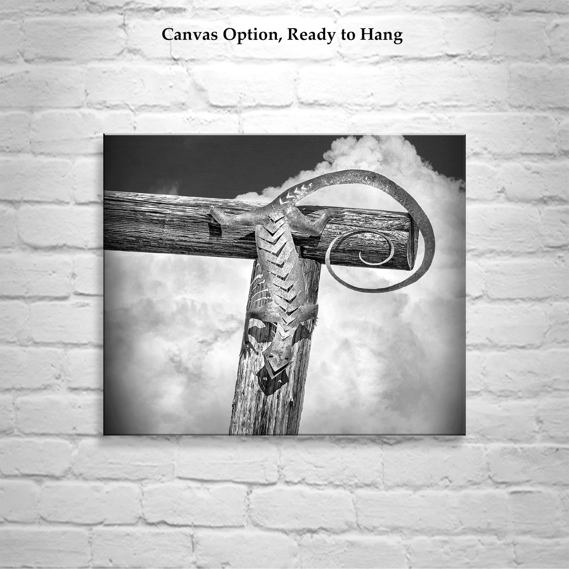 From the southern Arizona outback, a metal lizard sculpture rests on a wooden ranch gate and eyes me warily! Photographed in the San Pedro River Valley, Arizona USA. Original, unique signed art by Murray Bolesta!