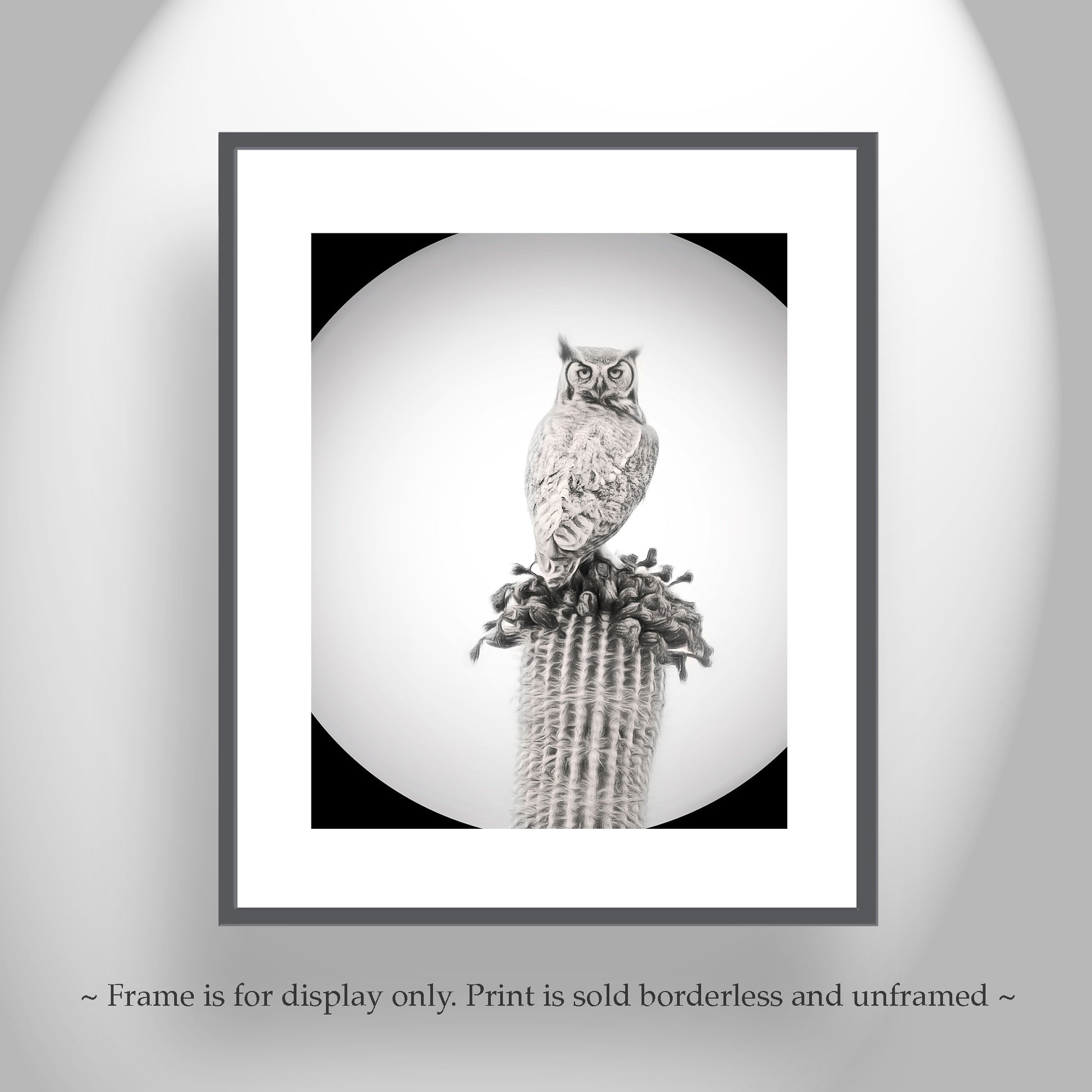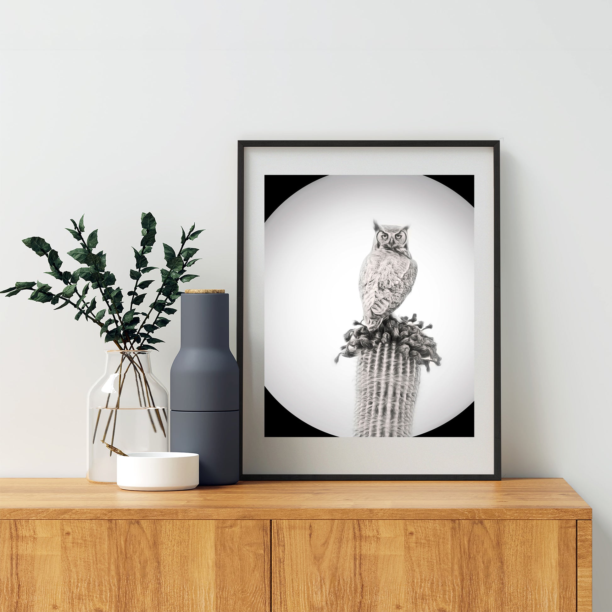 Owl Art Print as Black and White Desert Cactus Bird Artwork