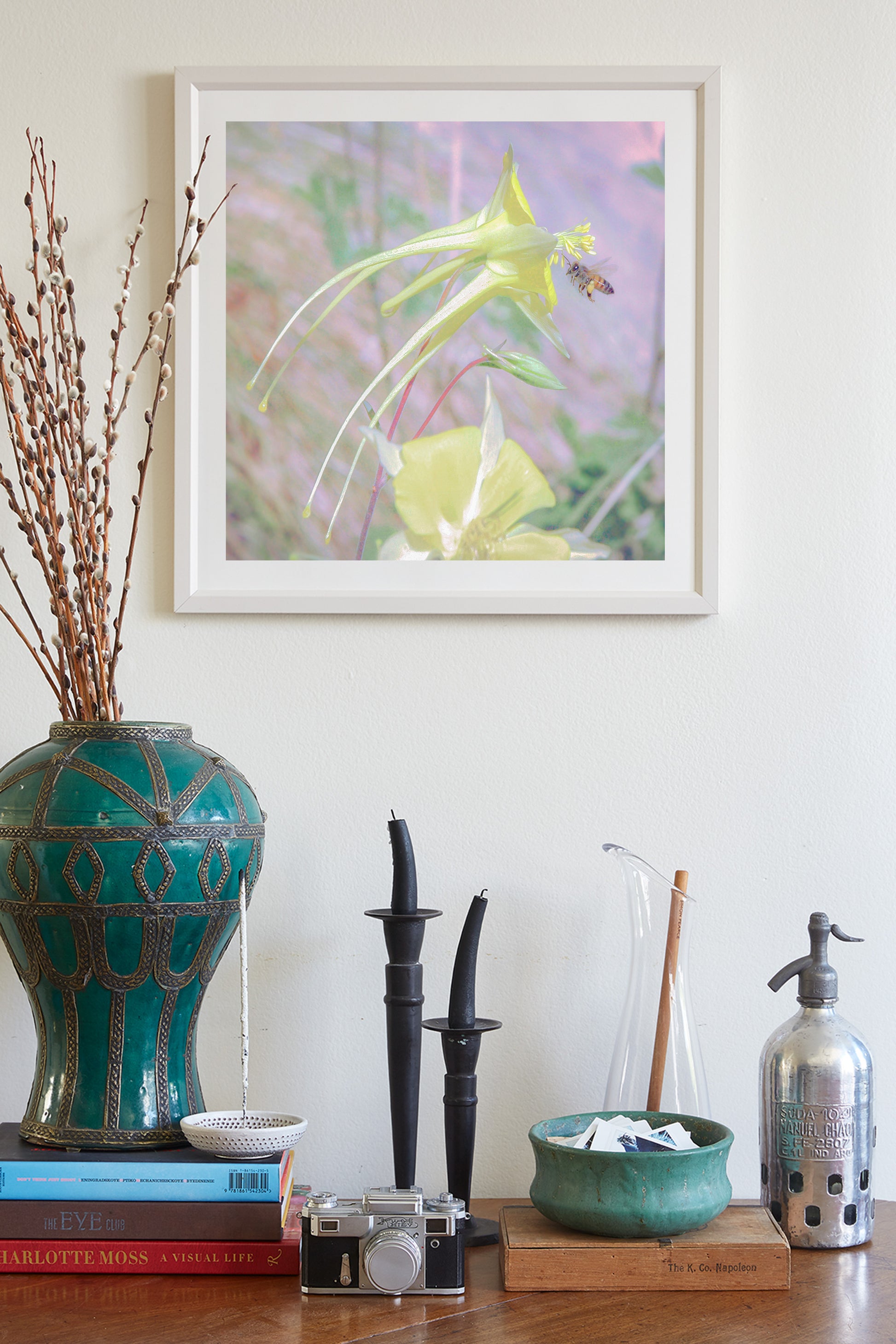 My beautiful square bumble bee photograph for your viewing pleasure! Here, a pollinator hovers at a wild yellow columbine flower, deep in a remote, watery wilderness canyon on the Mexico-Arizona border. Original, unique signed art by Murray Bolesta!