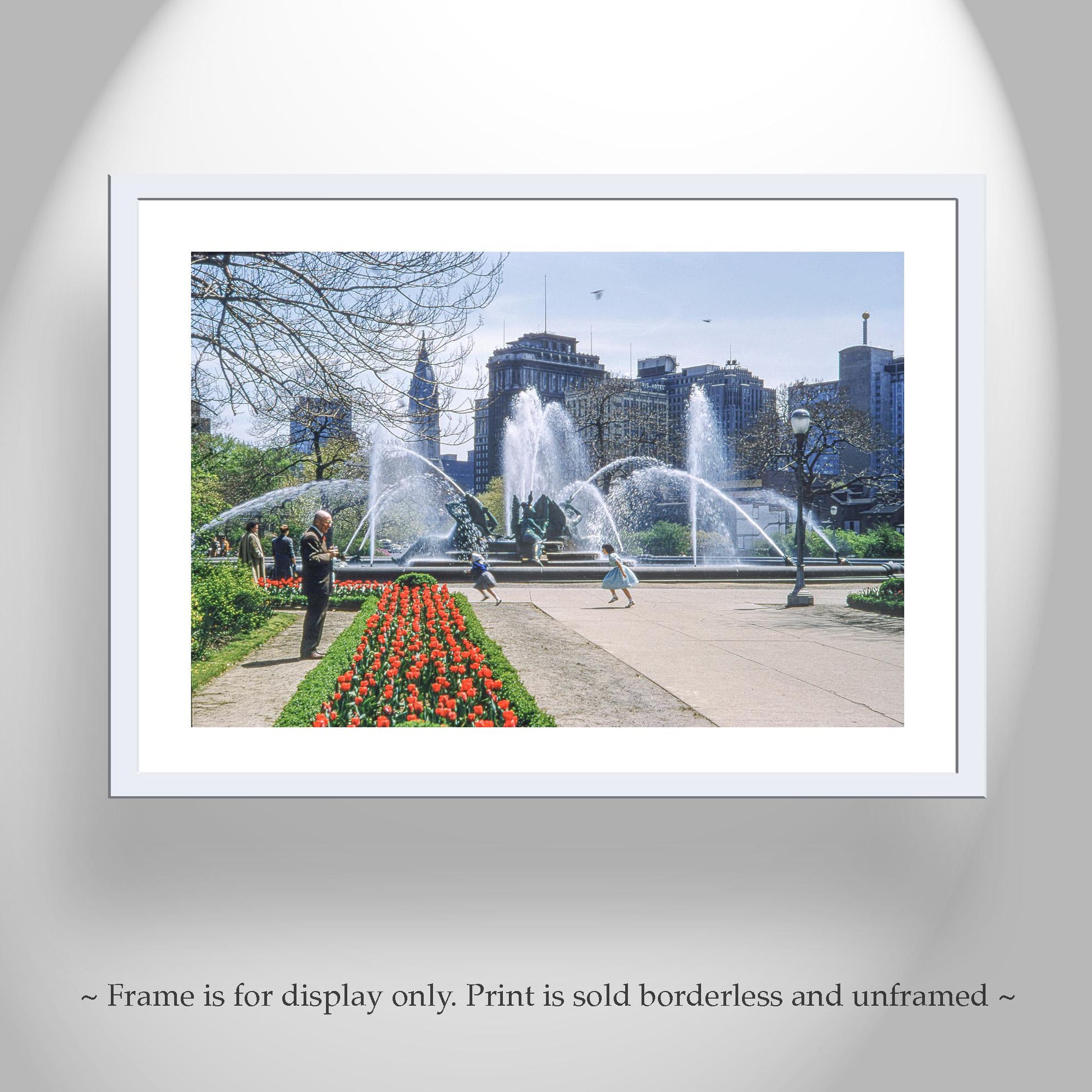 This unique, charming vintage photo is from Philadelphia, Pennsylvania, captured by my late father-in-law Professor Jean Cazemajou in 1958. Historic Logan Circle and its fountain is the centerpiece of Logan Square, one of five original planned squares laid out on the city grid by William Penn. The fountain is the art deco Swann Memorial Fountain. A French girl is seen chasing another French girl who eventually I would marry!