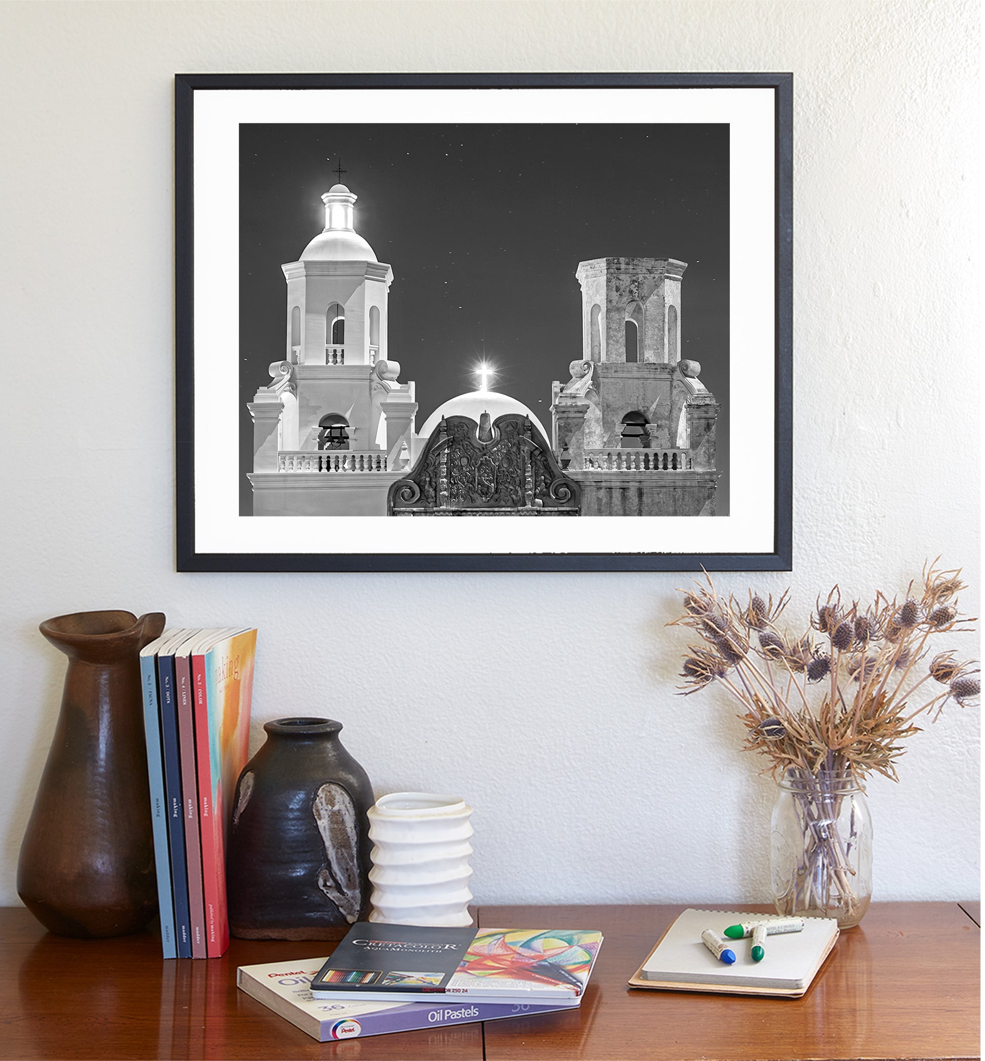 Beautiful black & white night photography church art! My elegant Tucson Arizona Spanish mission print for your walls: unique San Xavier del Bac cathedral, a gem of an Arizona destination. This is Father Kino's "White Dove of the Desert" in a Christmas-season night! Original, unique signed art by Murray Bolesta.