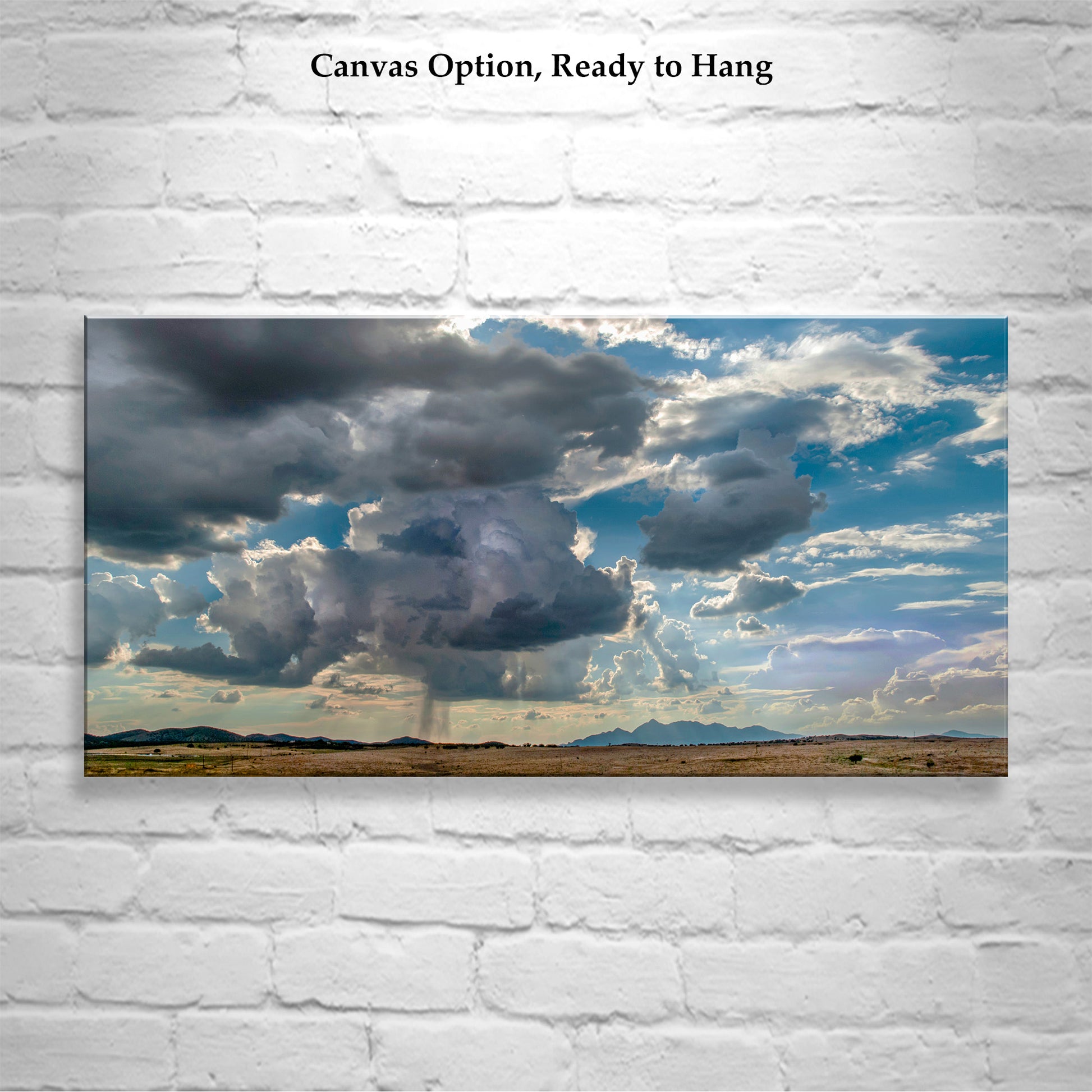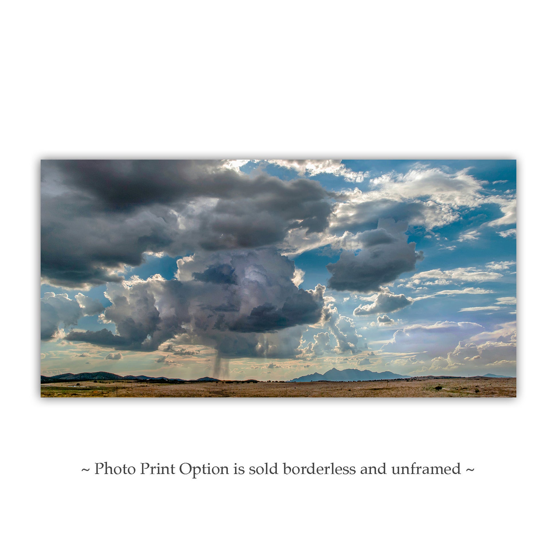 My wondrous wall art in panorama with desert ranch land monsoon storm clouds! A sublime scene of peace on the Arizona-Mexico border, this is Arizona prairie grasslands, common in several north-south borderland valleys. The Santa Rita Mountains rise in the distance. The season is the Sonoran Monsoon, with the most dramatic skies anywhere on Earth! Original, unique signed art by Murray Bolesta.