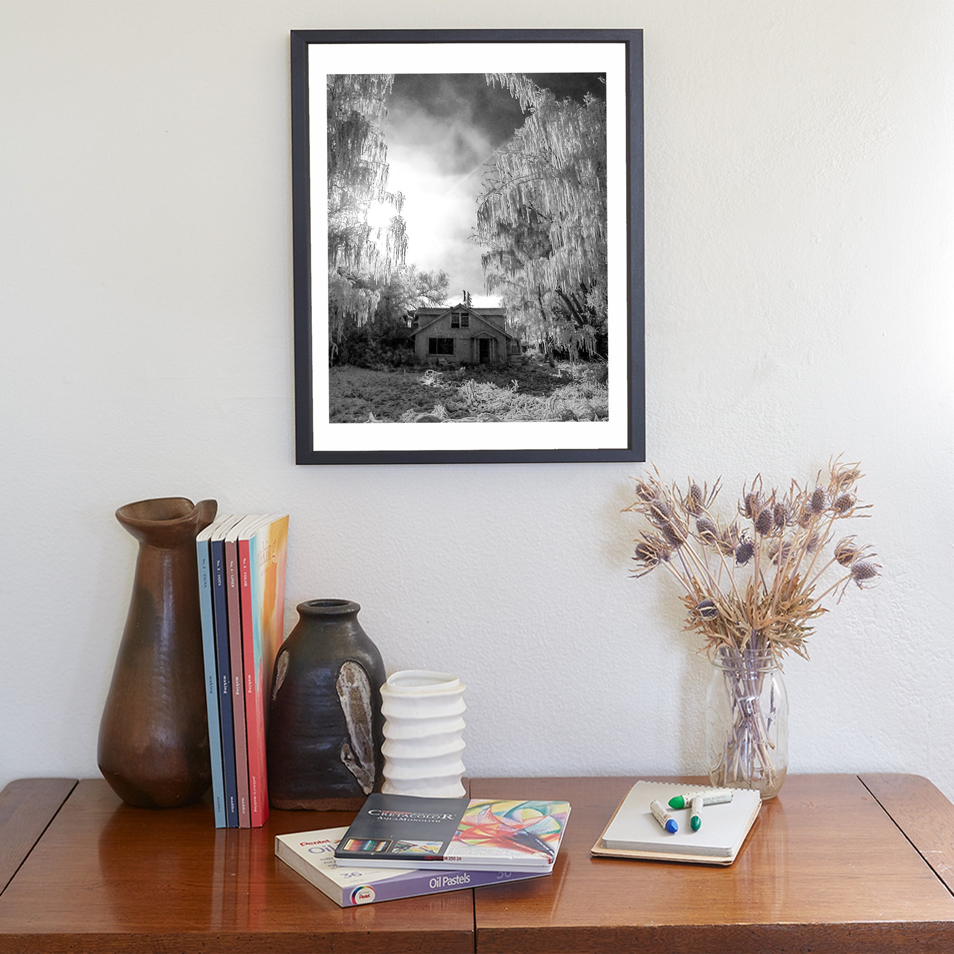 For your walls, my splendid spooky scene of a ghost house surrounded by rime ice, after a freezing foggy night! I captured this image in remote northeast California. Original, unique art by Murray Bolesta!