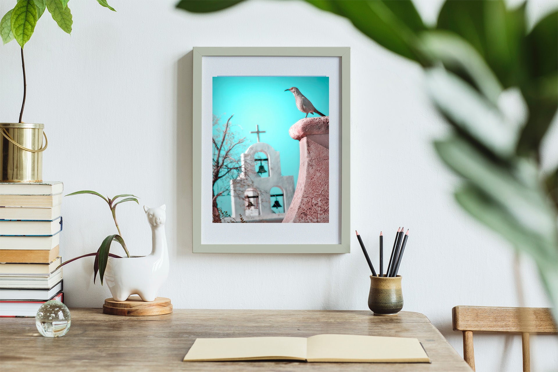 My surreal bird art of San Xavier del Bac, the Spanish colonial mission in Tucson Arizona, USA! This is the Mortuary Chapel, today housing statues of saints and candles for special prayers. A thrasher bird intervenes, balancing on one leg! Original, unique signed art by Murray Bolesta.