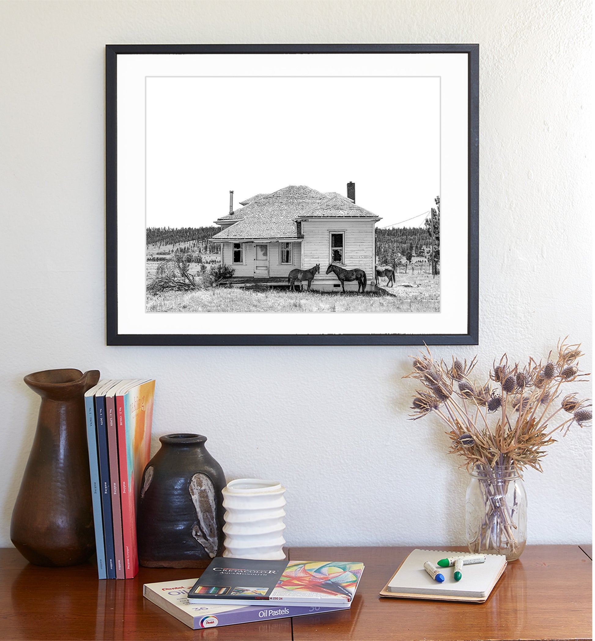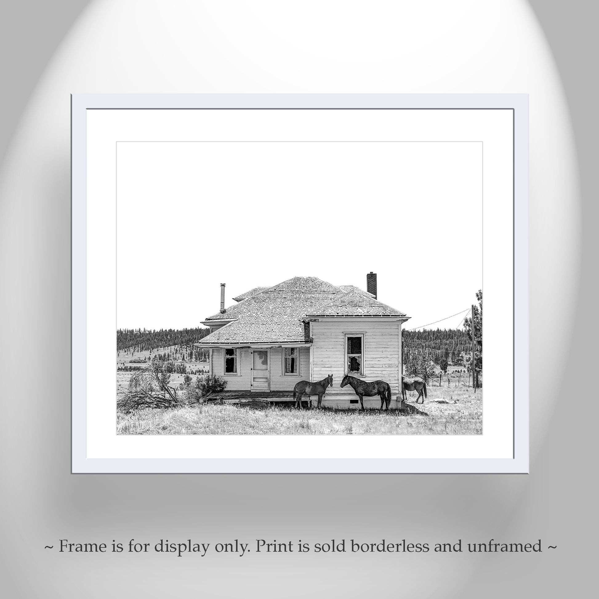 My marvelous moody black & white photo artwork with a some forlorn horses and the weathered ruins of an old house! I captured this compelling scene in an Indian reservation in the huge expanses of rural Oregon USA. Original, unique signed art by Murray Bolesta!