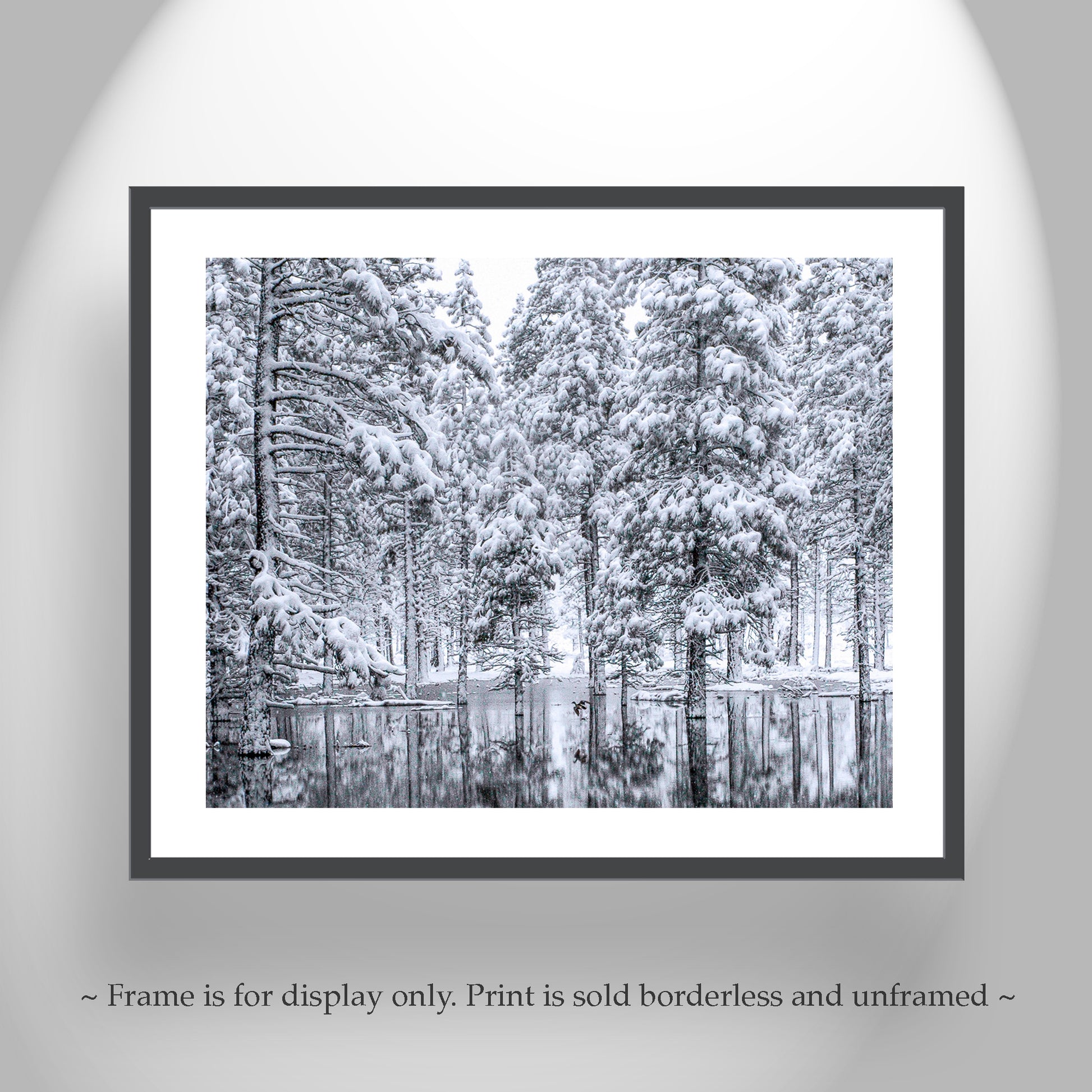 My wonderful winter wonderland picture with a flying bird! This critter may be a grebe or duck. I captured this scene in an increasingly rare moisture-laden winter in Modoc County of northeastern California! This image is in very pale blue-gray. Unique, original signed art by Murray Bolesta.