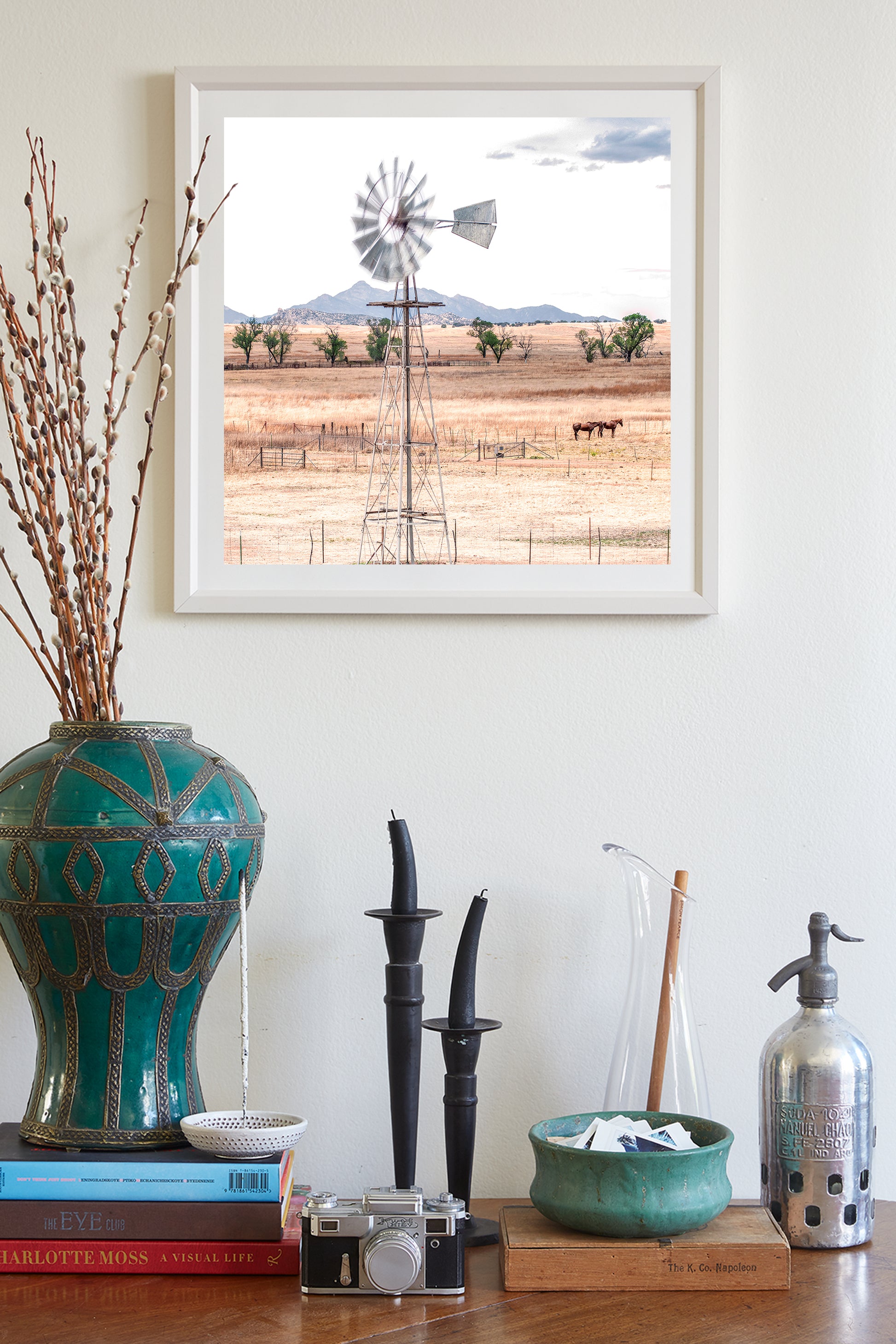 Western Horse Ranch Landscape Art with Windmill & Santa Rita Mountains