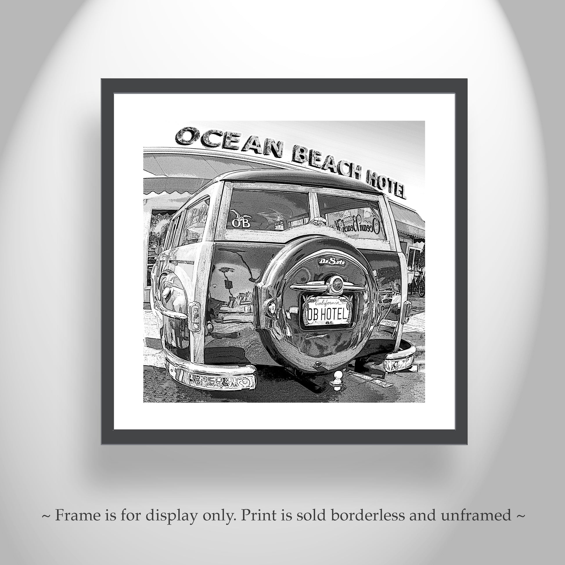 My beautiful California DeSoto surf wagon picture in black & white: an Ocean Beach special! Original, unique signed art by Murray Bolesta.
