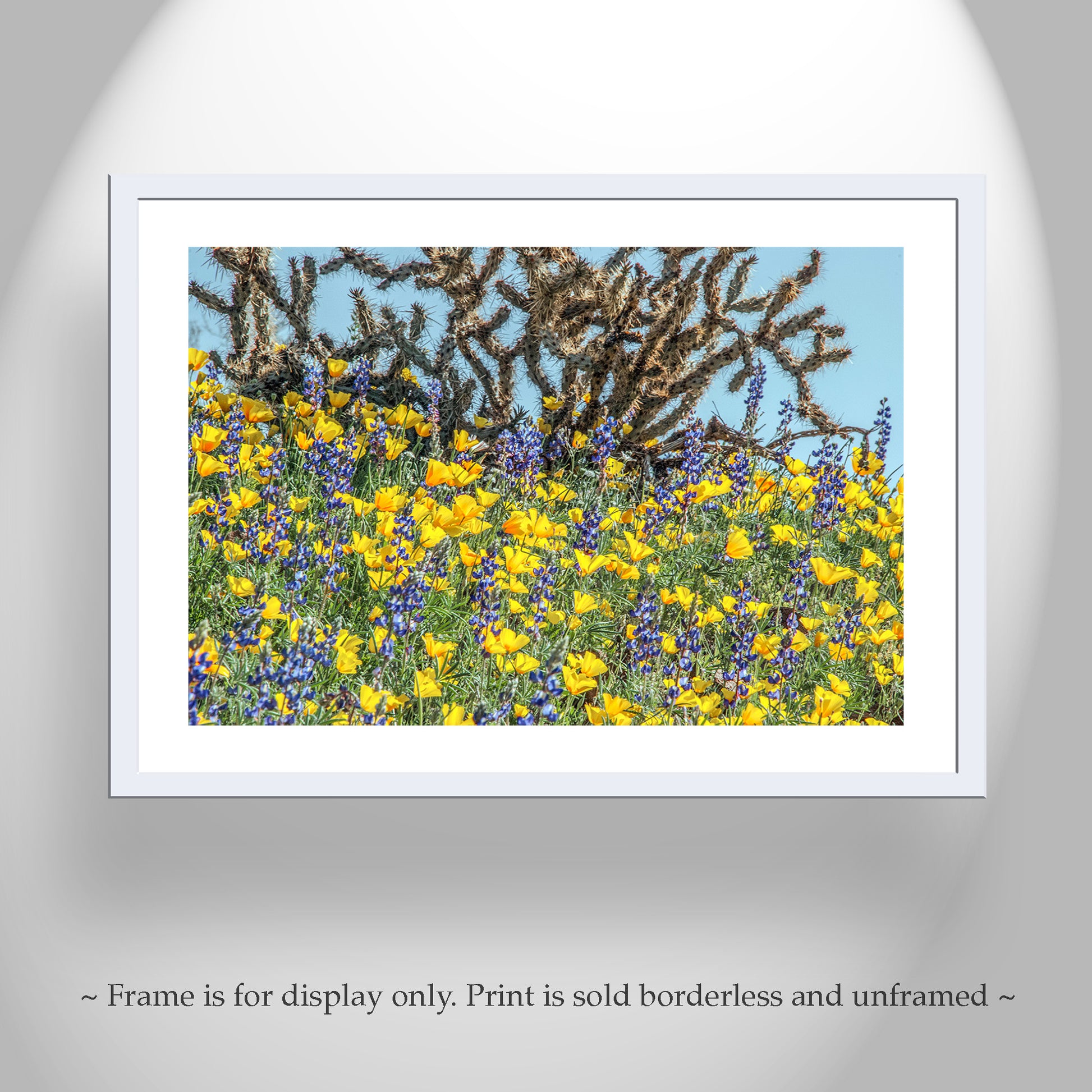 Splendid wildflowers at Picacho Peak, Arizona USA! For your viewing pleasure, here's my gorgeous desert scene with delicate Mexican gold poppies and desert lupine and prickly cholla cactus in the background. Original, unique signed art by Murray Bolesta!