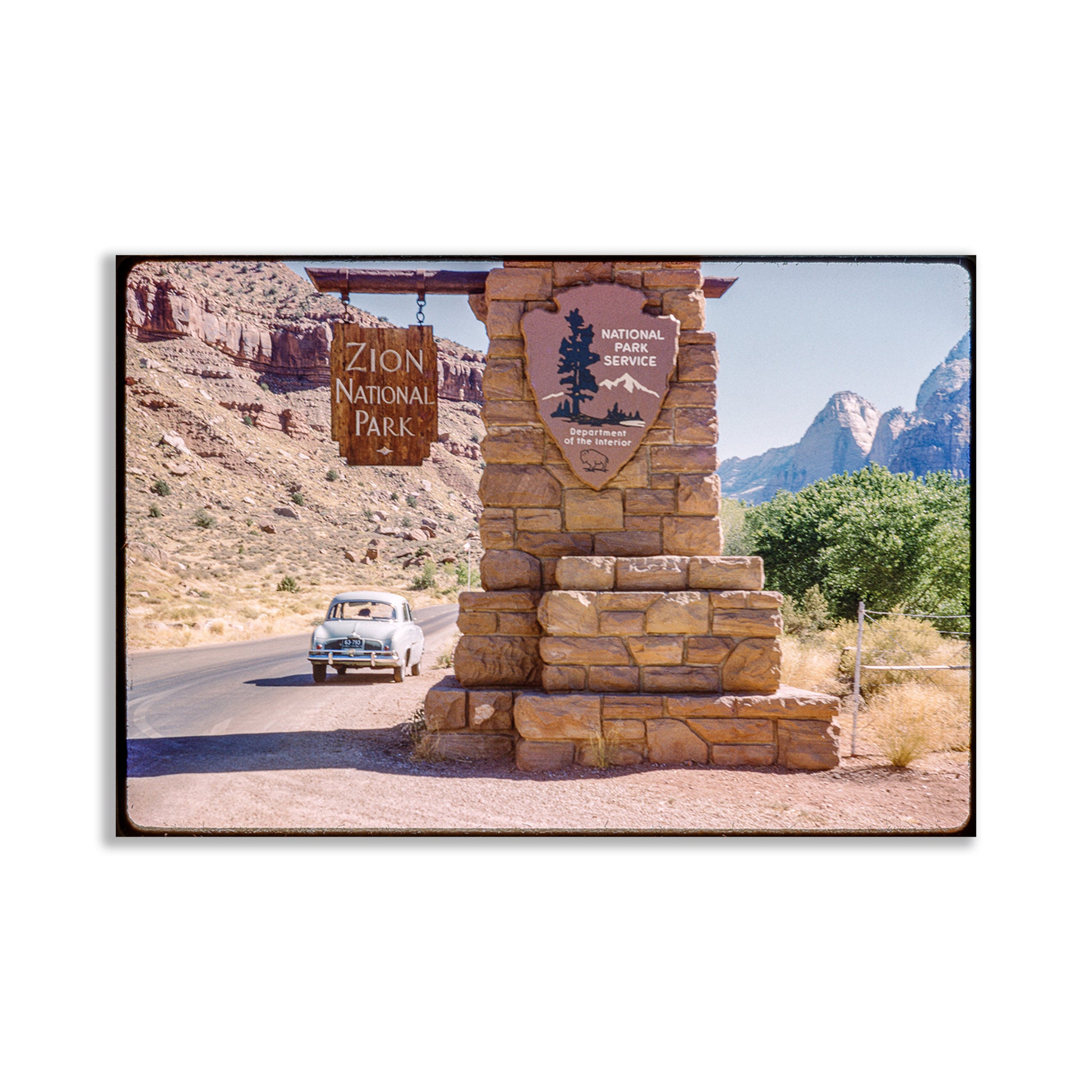 This charming photograph is from a desert summer in the days before automatic transmissions and air conditioning! It was captured by my late father-in-law Professor Jean Cazemajou in 1958 on a color photographic slide, and restored expertly by me. Zion National Park was a western stop in a cross-country road trip by my future wife Agnès and her parents after a year working in the United States. They drove that little Renault Dauphine reliably the whole way.